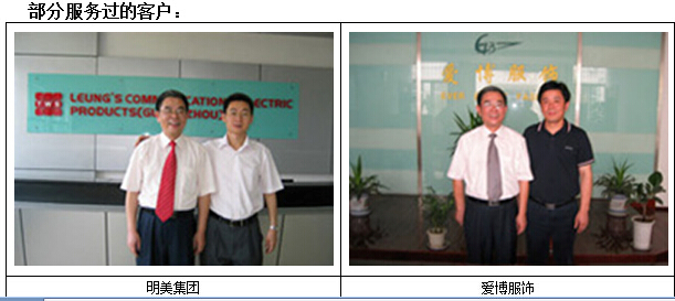 服务客户:电子、电器、电力行业:深圳市泰昂电子技术有限公司、东莞东阳光电容器有限公司、江门声辉电器有限公司、惠州大亚湾光弘科技电子有限公司、TDK东莞长安华南电子厂(日资) 、广州市雅江光电设备有限公司、惠州住成电装有限公司(日资)、东莞市爱铭数码电子有限公司(韩资)、深圳市国电科技发展有限公司、番禺八马蓄电池有限公司、珠海市云田电器有限公司、东莞光荣电业有限公司(港资)、广州梁氏通讯电器有限公司(港资)、佛山市广特电器有限公司、东莞元博电子股份有限公司(台资)、无锡飞翎电子有限公司、深圳南玻伟光导电模有限公司、深圳南玻电子有限公司、无锡市好达电子有限公司、无锡汉神电气有限公司、惠亚中山皆利士多层线路版有限公司、东莞科泰电子有限公司(芬兰)、天津市特变电工变压器有限公司、无锡市惠丰电子有限公司、信佳电子(深圳)有限公司、常州市快客电子设备有限公司、广州金溢科技有限公司、常州市云宇电子有限公司、乐域(东莞)塑胶电子制品有限公司、贵州国电电力有限公司织金发电厂、大唐电力、三门峡电力、东莞万迪电子有限公司、诺基亚机械、钢铁、五金行业:广东超华科技股份有限公司、东风雪铁龙有限公司、台翰模具制品(东莞)有限公司(台资)、惠州市银基电池配件有限公司(港资)、中山宝宝好日用制品有限公司、深圳锦祥实业有限公司(港资)、汇鸿塑胶五金制品(深圳)有限公司、深圳雅致五金厂(港资)、惠州富士精工(日资)、新会英姿五金制品有限公司、淄博义升环保设备有限公司、无锡美业机械制造有限公司、佛山市迅发陶瓷机械制造有限公司、苏州金鼎冶金有限公司(台资)、南京华舜轮毂有限公司、南京晨灿机械制造有限公司、无锡市冠云换热器有限公司、无锡市双翼消声器有限公司、广东康力日用品有限公司、泰安远东国际贸易有限公司、国泰精密机件(无锡)有限公司(港资)、广州雄义精密五金有限公司、南京民光高压油管厂、四川蓝星机械有限公司、佛山显威五金塑料制品有限公司、山东浩信机械有限公司、无锡德昶精密铸造有限公司、四川东汽铸造有限公司、淄博功力机械制造有限公司、东莞利成家具配件有限公司、洛阳LYC轴承有限公司、天津昊拓汽车检具有限公司、常熟华新特殊钢有限公司(台资)、佛山市威玮机械有限公司、佛山市巨大铝业有限公司、平顶山隆鑫三轮摩托车有限公司、深圳市长圆新材料股份有限公司、天津华北集团、东莞市金河田实业有限公司、昆明铁路车辆段、江苏一环环境工程有限公司、无锡钱桥带钢有限公司、无锡嘉龙铜业有限公司、常州鸿宝机械有限公司、福建闽侯闽兴编织品有限公司、常州盛德钢管有限公司、郑州市萨辛公司、江阴市华方科技合纤有限公司、江阴市勤丰金属制品有限公司、江阴市马镇南阳五金厂、无锡市金磊车辆部件有限公司、山东华兴机械股份有限公司、恒鑫(常州)精机有限公司(台资)、无锡市华昌特种铸造厂、东莞精辉表业有限公司(港资)、河南济源兴华机械有限公司、河南濮阳油田信宇机械化工有限公司、四川威远银星实业有限公司、深圳市骏达制造厂有限公司、常州市康利达顶尖模具有限公司、江苏华远电缆有限公司、江苏广汇电缆有限公司、徐州东亚钢铁有限公司、包装、印刷行业:深圳市华力包装贸易有限公司、深圳敦煌柯式印刷有限公司、深圳市国瑞印刷中心、建泰印刷(东莞)有限公司(港资)、江苏申乾印务有限公司、常熟方正塑料彩印包装有限公司、临沂恺贝包装印刷有限公司、东莞晨光印刷有限公司(港资)、佛山华新包装股份有限公司、临沂太平洋印刷包装有限公司 、 纺织、服装、鞋业:东莞宝德制衣有限公司(港资)、无锡洁隆纺织品有限公司、江阴南泰家纺用品有限公司、山东银仕来集团有限公司、佛山南海嘉恒鞋厂、江苏常熟艺博服装辅料有限公司、无锡爱博纺织服饰有限公司、火天集装袋(南京)有限公司、广州新澳翔服装有限公司、广州卡美多鞋业有限公司、江阴悦达印染有限公司、常熟创宇织造有限公司、深圳瑞基手袋有限公司、常熟市曲美制衣有限公司、东莞捷西皮革制品有限公司(台资)、淄博鑫东海服装有限公司、青岛大兴服装有限公司、东莞爱华服装人体模型有限公司(港资)、江苏洲艳服装有限公司、 中山通伟电脑车花制衣厂(澳资)、中山明兴毛织厂、常熟王牌龙服饰有限公司、东莞兆凯制衣厂(港资)、东莞润田服装工艺有限公司(港资)、江阴吴盛纺织有限公司、江苏润禾纺织有限公司、山东德信皮业有限公司、东莞华坚鞋业集团有限公司、江阴世纪龙制衣有限公司、江苏云蝠服饰股份有限公司、新腾纺织服装有限公司、注塑、玩具、文具行业:惠州速力特注塑有限公司(韩资)、华丰隆玩具(深圳)有限公司(港资)、深圳益智玩具食品有限公司(港资)、广州凯歌文具有限公司、淄博齐凯塑业有限公司、长安美太玩具家具、不锈钢行业:南海鸿兴海绵有限公司、佛山市建缘不锈钢制品有限公司、佛山市南海活力家具有限公司、广州西野展示家私有限公司、东莞杰高音响家具有限公司、佛山南海双兴不锈钢有限公司、中山市华盛家具制造有限公司、成都好风景实业有限公司、成都南方家私有限公司、变色龙家私、广东欧派家