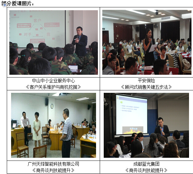 主讲课程:《客户开发与客户关系深度营销》、《大客户关系管理与销售策略》、《大客户关系营销实战》、《营销博弈与商务谈判技能提升》、《政企客户拜访艺术与商务议价谈判》、《客户拜访艺术与商务议价谈判》、《顾问式销售五步法》、《商务谈判技能提升》、《政企大客户营销能力提升》、《集团客户深度捆绑与拓展策略》