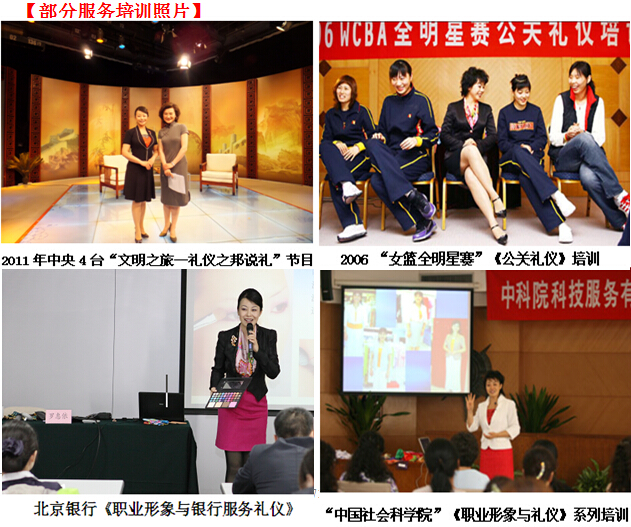 【授课特点】1、 气质优雅,思路清晰,语言生动,互动性强,深入浅出,记忆深刻,是极富个人魅力的资深培训师,具备丰富的培训经验及个性服务经验;2、 应用所擅长的“成年人高效学习方法”,带领学员在愉悦的学习气氛中,现场“理解、记忆”众多礼仪知识点90%以上;3、 现场练习掌握礼仪举止技巧、得到老师的现场指导纠正,同时配合为企事业做好课后辅导,协助客户收到培训现场的实效,并保持培训良好的后效。【部分服务过客户】百度科技有限公司、摩托罗拉公司、中海油、中石化、中国社会科学院、中国人民银行、中国交通银行、中国光大银行、北京银行、工商银行、兴业银行、新华人寿保险公司、东方航空、海南航空、福田汽车、奥迪汽车、环球贸易中心、北京电力局、天津电力公司、石家庄供电公司、佛山供电局、廊坊供电局、联想集团、金隅地产国际集团北控集团、重庆人民检察院、北京海淀法院、丰台税务局、玲珑轮胎集团、北京海淀医院、博爱医院、天安假日高尔夫、清河湾高尔夫、潍坊宝瑞富华游乐园、华联商厦、雅芳公司、宜家家居、清华大学MBA班、北京大学MBA班、华北电力大学MBA班、对外经济贸易大学等。